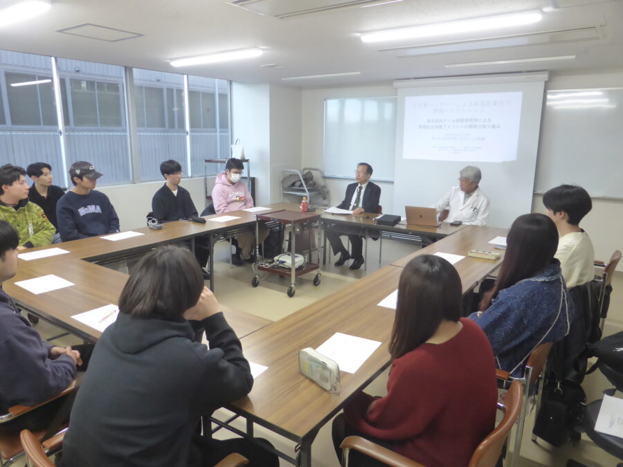 帝京大学経済学部の三竝ゼミにて、昨年と同様に講義を行いました。今回は(株)ゲノム創薬研究所の共同創業者でもある薬学部関水和久特任教授にも参加してもらい、「創薬とベンチャー企業」をテーマとした内容となりました。最初に私から日本経済と産学連携の現状とベンチャー企業と企業組織の重要性と特許の有効性と弱点の説明しました。そして、関水和久特任教授より、実験動物としてのカイコの有効性、(株)ゲノム創薬が保有している乳酸菌の特長の説明がありました。そして開発中の新規抗生物質のライソシンEは、大型の公的助成金を獲得して、臨床試験がいよいよ始まる見込みという現在進行形の研究活動の説明がありました。最後に、講義が行われた医真菌センターのP2実験室(病原菌も扱うことが可能)の見学会も行うことができました。